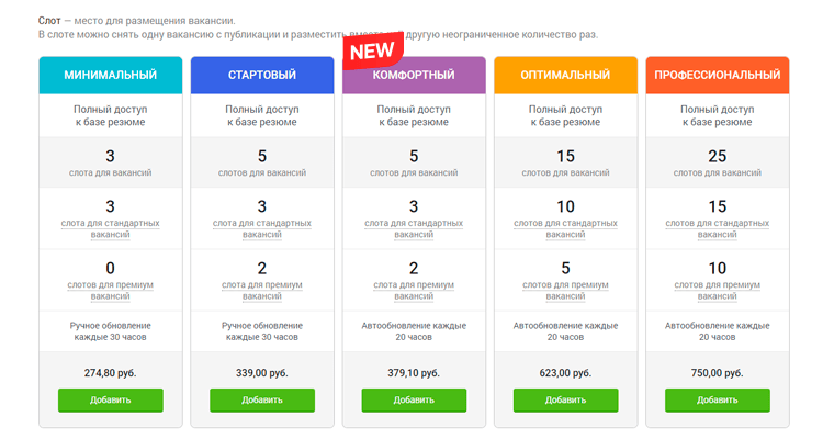 Поэтому мы разработали новый тарифный план «Комфортный», который включает пять слотов для размещения вакансий: три слота для стандартных вакансий и два слота для премиум вакансий. Также данный тарифный план включает автообновление даты вакансий каждые 20 часов.