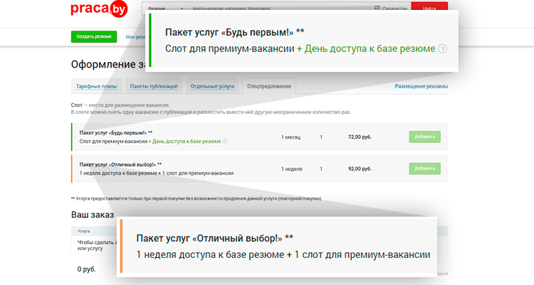 Заботясь о вашем удобстве, мы разработали новые спецпредложения, которые доступны при первой покупке. Пакет услуг «Будь первым» включает: слот для размещения премиум-вакансии + день доступа к базе резюме. Новая услуга «Отличный выбор» включает неделю доступа к базе резюме + слот для размещения премиум-вакансии.