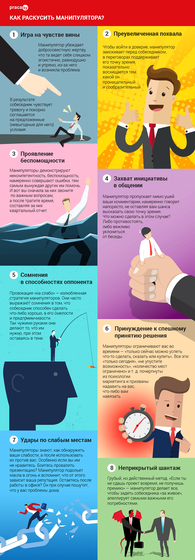 Манипуляторы — люди, которые взывают к вашим лучшим качествам, а после используют вас в своих целях. Чтобы вами не управляли против вашей воли, нужно знать ключи к скрытым угрозам. Как раскусить манипулятора и не попасться на его удочку? Изучите восемь классических тактик манипуляторов и включите их в свою шпаргалку.