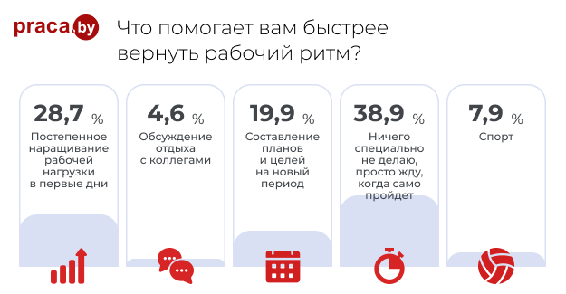 Несколько удивительно, но большинство (38,9 %) ничего не делают и ждут, пока постпраздничный синдром улетучится сам по себе. Вообще, эксперты рекомендуют создавать «мост» между праздником и работой. Главное — не требовать от себя высокой продуктивности в первые дни. Возвращение — это не переключатель, а диммер. Именно такой стратегии придерживаются 28,7 %.