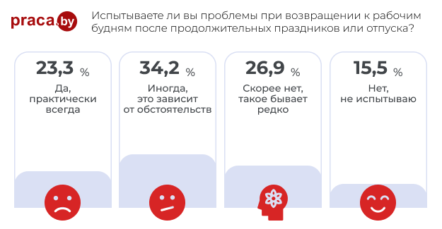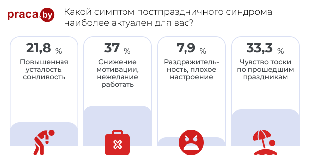 Вообще, совершенно нормально, когда человек испытывает так называемый постпраздничный синдром, или синдром возвращения. Мозгу нужно время, чтобы переключиться с режима «отдых и дофамин» обратно на «рутину и отложенное удовольствие», особенно когда у вас не очень креативная работа. 15,5 % опрошенных уверяют, что у них вообще нет никаких проблем, возможно, они особо и не празднуют. Остальные участники опроса в той или иной мере сталкиваются с проблемами, особенно в тех случаях, когда праздники были продолжительными.