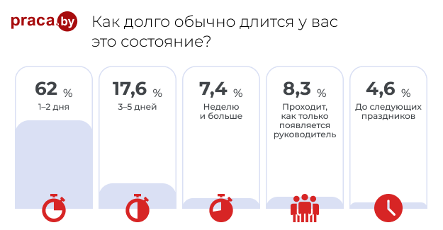 Вообще, постпраздничный синдром длится в среднем 3–5 дней. Но среди участников нашего опроса этот вариант ответа оказался вторым по популярности (17,6 %). Самый популярный вариант — 1–2 дня (62 %). Удивительно, что люди так быстро приходят в себя после праздников; возможно, потому что они не такие продолжительные, как у некоторых, или праздники отмечались скромно. Не исключаю, что в праздники офисные сотрудники брали работу домой.