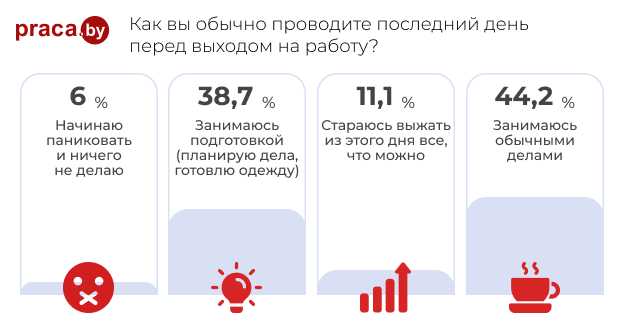 Мнения разделились практически поровну. 44,2 % никак не готовятся к выходу на работу после длительного перерыва, и, напротив, 38,7 % готовятся к нему, понимая, что лучше это сделать и избежать резкого перехода. Эксперты, например, предлагают составить список вещей, которые больше всего пугают при выходе на работу, и рядом — одно минимальное действие для каждой.
