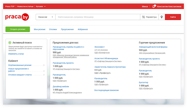 Заботясь о вашем удобстве, мы сделали главную страницу намного информативнее. После авторизации на сайте вы сможете увидеть свой статус поиска работы, ссылку на список своих резюме, а также количество полученных предложений работы и откликов, на которые пока не получен ответ работодателя. В отдельный блок вынесен список рекомендованных вам вакансий и горячие предложения.
