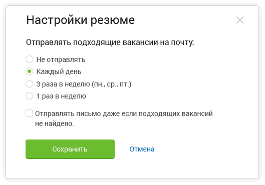 Кроме того, в настройках резюме вы можете настроить периодичность рассылки автопоиска вакансий.