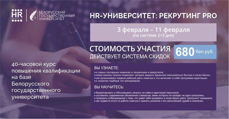Белорусский государственный университет предлагает образовательную программу повышения квалификации «HR-университет БГУ: рекрутинг PRO» с 03 по 11 февраля 2017 года (по системе 2+3 дня). Данный курс охватывает весь процесс подбора персонала: планирование, поиск, оценка, интервьюирование, принятие решения о выборе кандидата, адаптация, а также специфический рекрутинг. По окончании обучения слушатели получат свидетельство государственного образца и смогут самостоятельно планировать ресурсы на рекрутинг, осуществлять поиск персонала разных категорий, проводить биографическое, телефонное интервью по компетенциям, а также готовить итоговое предложение о работе для кандидатов и руководства компании. Каждый блок программы отрабатывается практикой через созданный алгоритм поведения, через кейсы, максимально приближенные к реальной деятельности.
