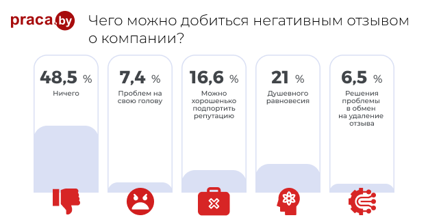 Репутация выстраивается годами, а потерять ее можно очень быстро. В одном из исследований, посвященных этой проблеме, приводится цифра в 70 %. Именно столько респондентов заявили, что они бы сильно насторожились, прежде чем трудоустраиваться в компанию, если прочитали негативный отзыв о ней; а если бы таких отзывов попалось несколько, то и вовсе перестали бы рассматривать ее в качестве потенциального места работы. Причем они сделали бы это, даже если бы были безработными.