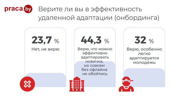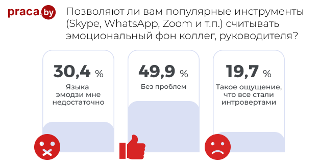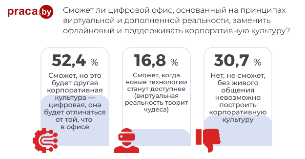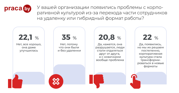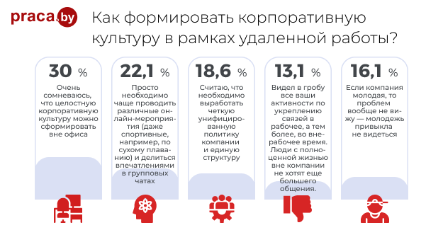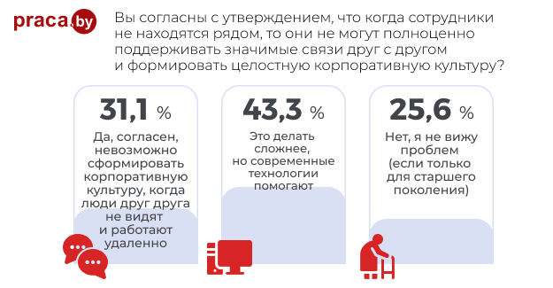 Мы провели собственный опрос среди пользователей praca.by. Я не буду его комментировать (пусть каждый попробует сделать собственные выводы), но не могу не отметить следующее. Более половины участников опроса считают, что мы идем к цифровой корпоративной культуре, естественно, современные технологии нам в помощь. Еще подтвердился мой тезис о том, что развитой корпоративной культуре не страшны удаленка или гибридный формат работы.