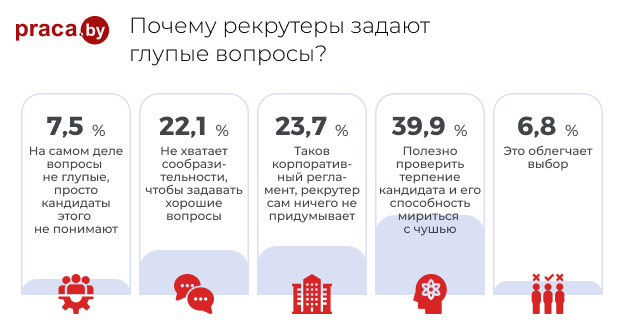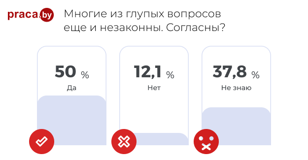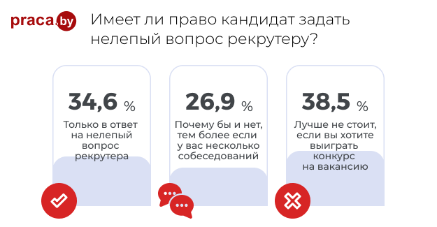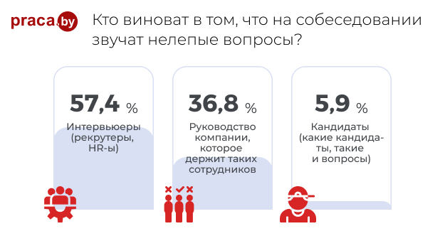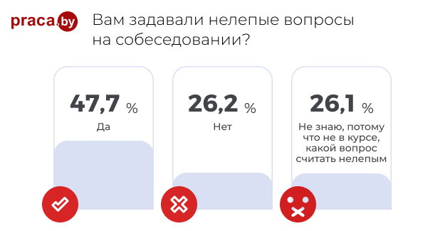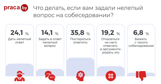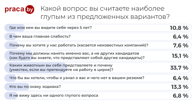 Нет сомнений, что вы в роли кандидата можете нарваться на нелепый вопрос. Оставайтесь уверенными, улыбайтесь, но не ехидно, и не торопитесь с ответом. Удачи! Ну и, конечно, познакомьтесь с результатами нашего опроса, наверняка они будут весьма полезны.