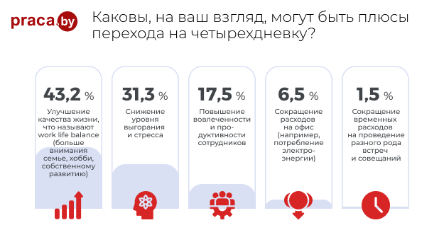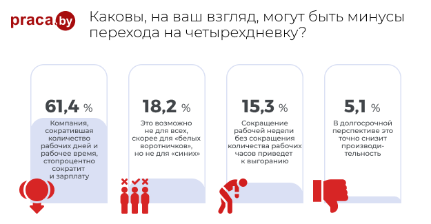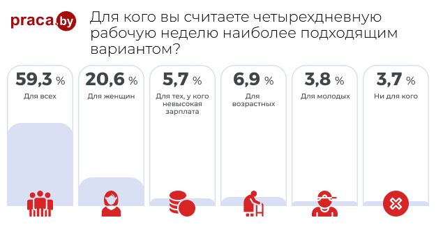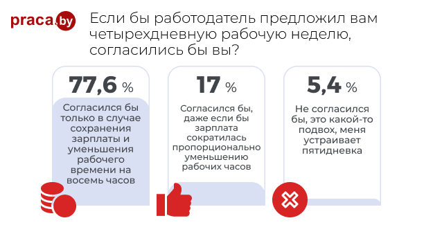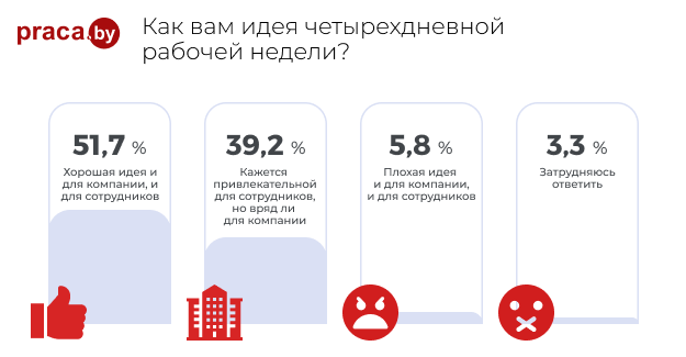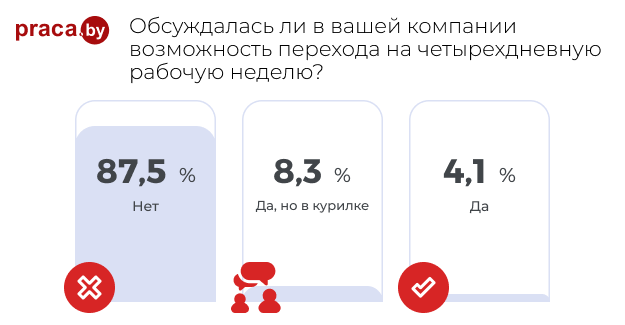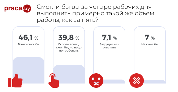 Эксперименты с четырехдневной рабочей неделей начали проводить еще в середине прошлого века. Другое дело, что этим занимались редкие компании, а сейчас мало того что компаний стало в разы больше, так еще и государства стали пробовать подобные эксперименты, например, Исландия, где эксперимент шел целых четыре года и признан успешным. Мы решили узнать, как относятся к четырехдневной неделе в Беларуси, и на портале Praca.by провели опрос, который, как оказалось, вызвал большой интерес (приняло участие более 5,5 тыс. человек). Между прочим, в байнете появилась информация о том, что в Беларуси есть IT-компания, где перешли на четырехдневную рабочую неделю.