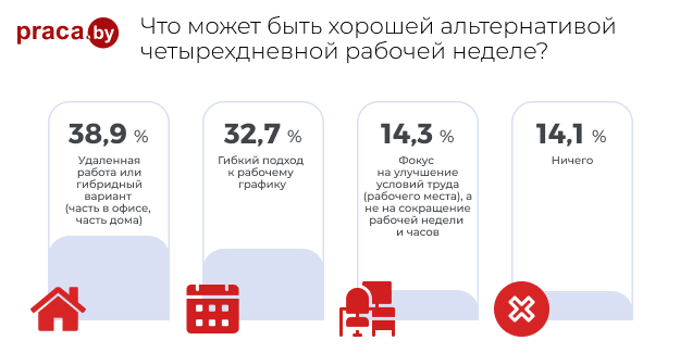 У четырехдневки на самом деле есть альтернативы. И пандемия в этом смысле помогла росту их популярности. Так, очень многим нравится гибридный подход, т.е. когда можно работать и дома, и в офисе (38,9 %). Гибкие подходы к графику тоже хороши (32,7 %), они позволяют удобно для человека распределять свою активность. Интересно, что на Западе тренд на удаленную работу получил оппонента в виде создания максимально хороших условий труда на работе, т.е. фактически работа становится вторым домом (у нас 14,1 %). Это реализуемо прежде всего в высокотехнологичных компаниях.