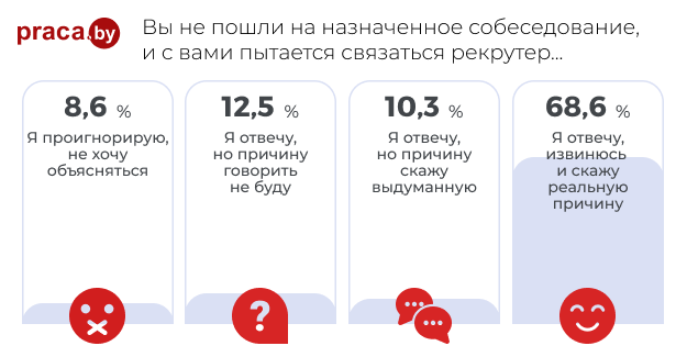 В некотором смысле наш второй вопрос — это вопрос-ловушка. Казалось бы, какая красота: свыше 90 % суммарно готовы ответить рекрутеру; из них 68,6 % даже объяснят реальную причину, почему не появились на собеседовании. Ну о каком гостинге может идти речь, если всего 8,6 % проигнорируют попытки до них дозвониться или дописаться. Подвох в том, что это рекрутер звонит и пишет кандидатам и просит объясниться, а не кандидаты предупреждают, что по какой-то причине (представим, что самой уважительной) не придут на собеседование.