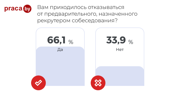 Без малого 2/3 участников опроса (66,1 %) подтвердили, что им приходилось отказываться от назначенного собеседования. С одной стороны, такой высокий процент можно объяснить тем, что кандидат в активном поиске рассылает резюме в несколько компаний и, соответственно, откликается на предложения сразу нескольких рекрутеров. С другой стороны, такая цифра может вызывать и тревогу. Если договорился о собеседовании, нужно выполнять свои обязательства или, в крайнем случае, вежливо и вовремя отменить. Словом, цифра очень большая, и если пораскинуть мозгами, то говорит, скорее, о том, что кандидаты относятся к договоренностям легкомысленно.