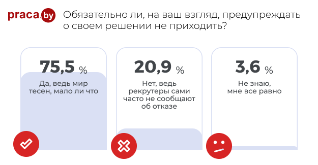 Результаты ответа на последний вопрос несколько удивили, хотя, с другой стороны, мы ведь далеко не всегда действуем так, как думаем. Да, 75,5 % выбрали ответ, предполагающий предупреждение о неявке, но на практике, по другим исследованиям, от 30 до 40 % кандидатов не только не информируют, а исчезают с концами.