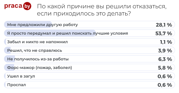 В самом популярном варианте ответа, который набрал 53,7 %, вроде бы нет ничего плохого, если кандидат набрался смелости и предупредил заблаговременно, что на собеседовании не появится. Впрочем, как и в других вариантах, кроме «ушел в загул». Даже вариант «забыл и никто не напомнил» не такой критичный, и если почитать рекомендации для рекрутеров, которые сталкиваются с недоходимостью, там первым пунктом будет речь о напоминании кандидату. Так вот, все можно понять, но при условии информирования нанимающей стороны.