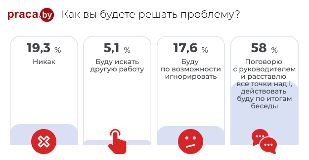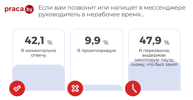 Впрочем, сами сотрудники являются кузнецами своего «счастья», приучая руководителей связываться с ними в любое время. Постоянно переписываясь с руководителем, сотрудник показывает, что с ним можно связываться в любое время. То есть проблема может быть и в самом сотруднике, который старается показать свою лояльность. 42 % участников опроса моментально готовы ответить руководителю, даже если им это не нравится; почти 48 % сделают это через паузу и только около 10 % проигнорируют.