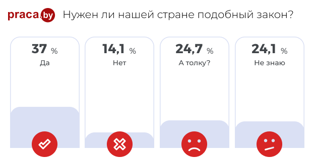 Первый вопрос, который мы решили задать пользователям нашего работного сайта: «Нужен ли подобный закон в нашей стране?». Я бы обратил внимание на два момента. Во-первых, важен не только закон, но и как он будет выполняться. Если он оторван от жизни, то какой в нем прок? Например, Трудовой кодекс запрещает дискриминацию в сфере трудовых отношений, но это не значит, что запрет настолько эффективен (вряд ли кто-то вам откажет в письменном виде, сославшись, например, на то, что вы возрастной кандидат). То есть если внести соответствующие поправки в Трудовой кодекс, то вряд ли это принесет какой-то выдающийся результат, хотя сам факт может положительно повлиять на общую ситуацию. Во-вторых, если внимательно присмотреться к Трудовому кодексу, то там можно найти достаточно статей, которые защищают работника (речь о времени отдыха, в т.ч. в выходные и нерабочие праздничные дни, отпуска), и подобные поправки избыточны. Проблема в другой плоскости, а именно в правовой грамотности работника. Тот, кто не хочет, чтобы его беспокоили в нерабочее время, просто игнорирует сообщения и звонки: он знает свои права и защищен. Впрочем, большинство участников нашего опроса (37 %) считают, что такой закон нужен, и лишь 14 % ответили отрицательно. Почти 25 % логично считают, что толку от этого будет мало, и почти столько же не знают, что из этого выйдет.