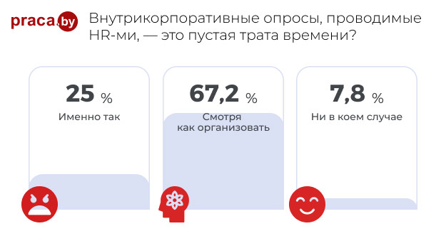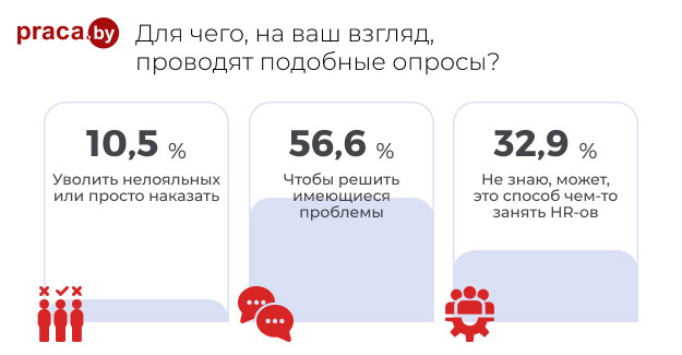 Общий беглый взгляд на результаты несколько удивил. Такое ощущение, что в опросе участвовало очень много HR-ов, и, естественно, они не могли плохо отзываться о том, чем сами занимаются. Не исключено, что и сотрудники заскучали по обратной связи, поэтому отвечали в позитивном ключе. Так, на вопрос: «Для чего проводят подобные опросы?» большинство (56,6 %) ответило: чтобы решить имеющиеся проблемы. Правда, немало и тех (32,9 %), кто ответил со скепсисом, а именно, что это способ занять чем-то HR-ов. Невероятно выглядит цифра 67,2 % при ответе на вопрос: «Не являются ли подобные опросы пустой тратой времени?». Столько участников выбрали ответ «Смотря как организовать». А это говорит о том, что если опросы и не очень популярны среди сотрудников, то не потому, что они в принципе не нравятся, причина, скорее, в неправильной организации. Если же к нему подойти правильно, то и вовлеченность увеличится, а значит, и польза будет. И все же и в этом случае скептиков достаточно (25 %).