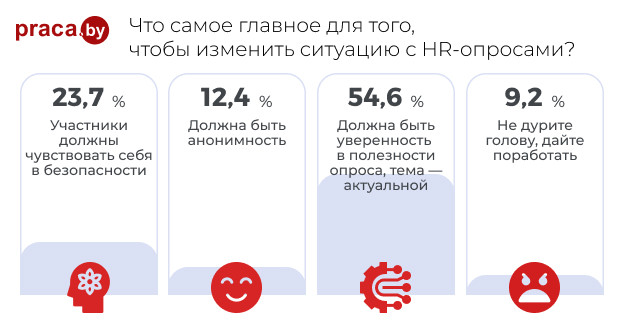 Не так давно в социальных сетях активно обсуждалась история, случившаяся в индийской компании. Руководство поручило HR-отделу провести опрос сотрудников из-за снижающейся продуктивности. Резонно в такой ситуации проанализировать причины и сделать какие-то выводы. Обычно подобные опросы сопровождаются уверениями HR-ов, что это делается в благих целях и стоит отвечать правдиво, чтобы информация помогла решить проблему. Тех, кто разоткровенничался в опросе и отметил, что испытывает стресс, уволили (таких оказалось 100 человек), чтобы сделать атмосферу здоровой. Чуть позже появилась информация, что никто не пострадал и это был просто эксперимент. Но так бывает не всегда. К сожалению, HR-опросы действительно больше напоминают орудие для расправы, чем инструмент, позволяющий выявить проблему и главное — найти правильное решение. Поэтому они не пользуются популярностью у сотрудников, в лучшем случае они считают их пустой тратой времени, а в худшем просто боятся и врут, отвечая на вопросы. Мы решили провести собственный опрос и узнать, так ли это.
